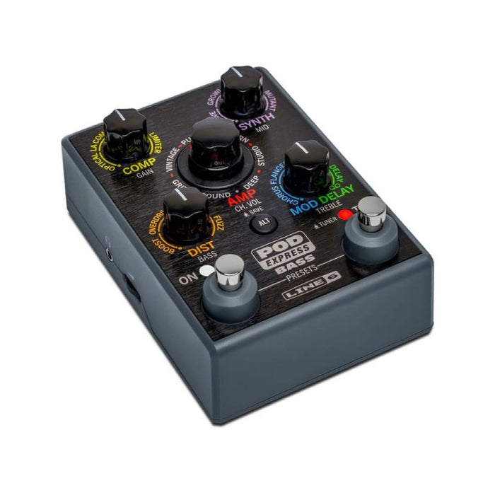 Operating the POD Express Bass is as easy as can be. Its 5-knob interface includes Comp, Amp, Synth, Distortion, and Mod/Delay knobs that double as Gain, Mid, Channel Volume, Bass, and Treble knobs when you press the Alt button. You also get On and Tap footswitches. Finally, deploying the unit's built-in tuner and saving patches is just as intuitive. The POD Express is truly the most straightforward POD Line 6 has ever designed — just plug in and play!