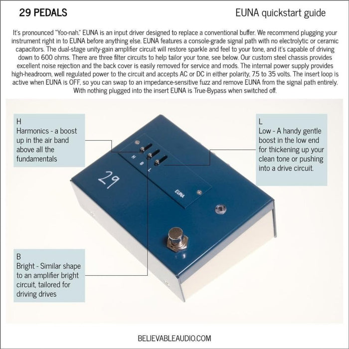 EUNA is handmade by 29 Pedals in California. Every component is hand-fitted and tested, including surface-mount parts.