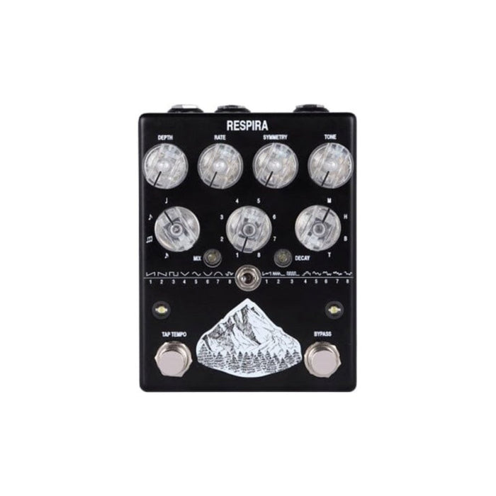 A truly special and pretty unique feature provided by the RESPIRA is the possibility to choose up to 4 tremolo modes by rotating the 4 positions switch on the right: M, H, B, T.
