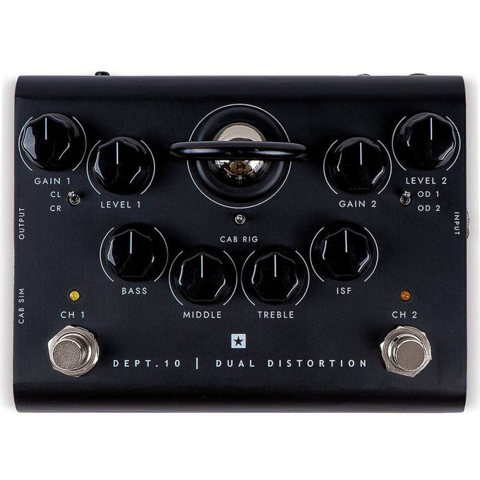 Equipped with a real ECC83 preamp tube, the Blackstar Department 10 Dual Distortion pedal is ready to breathe rich harmonic fire into whatever amplifier you choose. And thanks to its built-in Cab Rig simulator, you can skip the amp and inject the sound of a miked-up speaker cabinet direct to your recording interface or mixing board. You're even equipped for direct recording to your DAW, courtesy of a built-in USB audio interface. Complete with two switchable channels, Blackstar's acclaimed ISF tone-shaping circuit, and a 3-band EQ, the Department 10 Dual Distortion is one of the most versatile distortion pedals around.