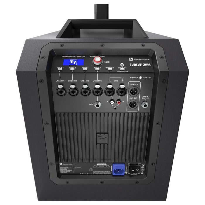 The Electro-Voice EVOLVE 30M is a versatile, ultra-compact PA system that's perfect for small and medium-sized venues. Packing 1000-watts of power, the Evolve 30M can be used on its own by solo artists or daisy-chained with other units for larger venues with ensembles. This PA system consists of three major parts: a potent 10" woofer, lightweight aluminum sub pole, and a column array with six 2.8" neodymium drivers. The Evolve 30M has a proprietary waveguide design that provides 120º of horizontal coverage and 40º of vertical coverage to ensure that the back of the house will always hear your mix. It has an onboard 8-channel digital mixer that can handle microphones, guitars, instruments, and many more. Featuring wireless control via the QuickSmart mobile app and seamless Bluetooth streaming, the Evolve 30M has enough functionality for almost any performer.
