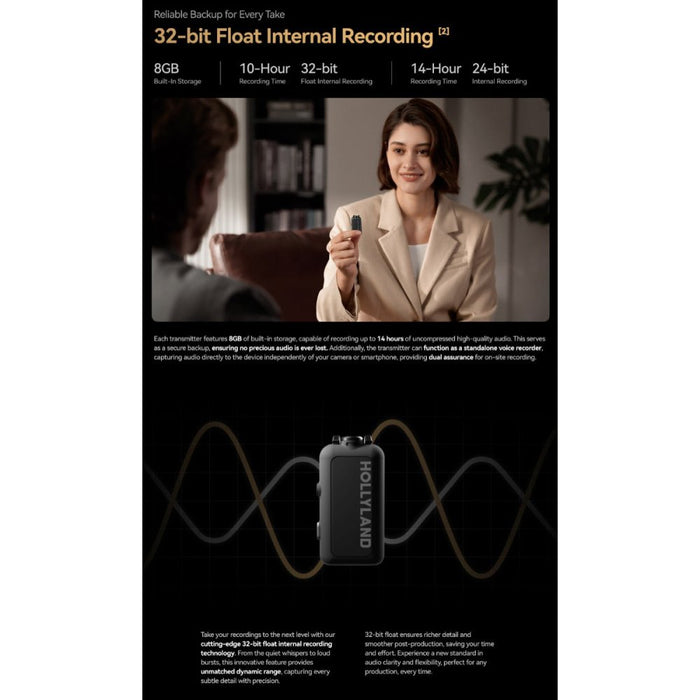 - 32-bit Float Internal Recording: 8GB storage captures 14 hours of uncompressed audio as backup