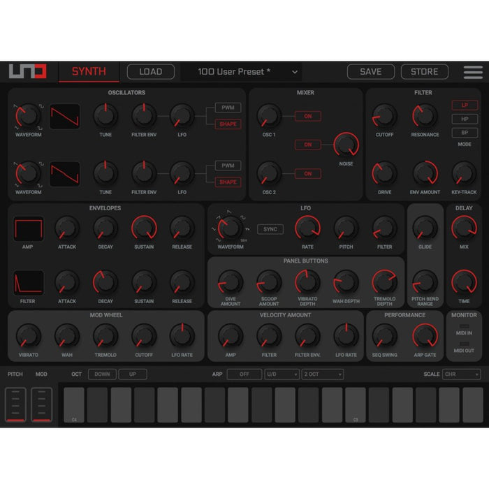 While UNO Synth is monophonic nature, its two independent oscillators can be tuned differently to also generate interesting pad-like interval sounds as well as octaves. Pulse width modulation of each oscillator provides the ability for a single oscillator to sound like two while the second oscillator can be tuned to an octave or interval for advanced modular-style timbres from the greatest classic synths.