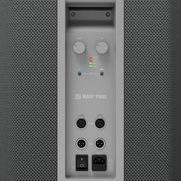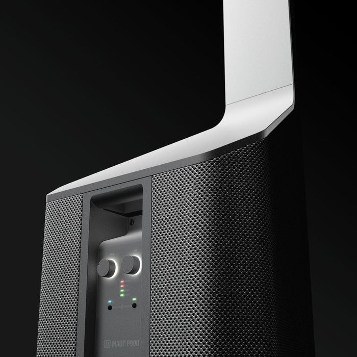 Constructed of high-strength aluminium with a multilayer mesh grille, the unique three-piece MAUI® P900 body features proprietary multi-pin connectors for instant cableless setup. The minimalist connector panel provides main and sub level controls plus XLR stereo line inputs and outputs for wired stereo operation of two systems.