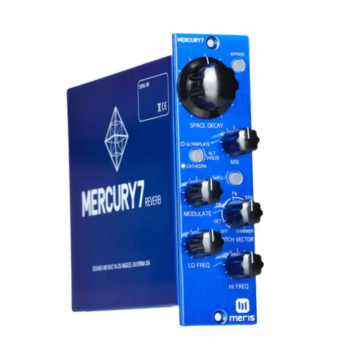 Taking its inspiration from the endlessly long and atmospheric modulated reverbs featured on the 1982 Blade Runner soundtrack by groundbreaking composer Vangelis, the Meris Mercury7 is a bold and exciting reverb in the 500 Series format that guitarists, synthesists, and sound designers will adore. Named for the original group of American astronauts, the Mercury7 is a space-traveling reverberator that features handcrafted algorithms and extensive modulation capabilities, for swirling, ethereal, and evocative reverbs. The Mercury7 boasts high- and low-frequency dampening to control its tonal characteristics and an awesome auto-swell function for epic ambient crescendos. To add harmonic complexity to the wet signal, Mercury7 offers a Pitch Vector control with several intervals, including slight pitch up and down, fifth up, octave up and down, and shimmer. Like all Meris effects, the Mercury7 has a deep feature set, accessible via a press-and-hold Alt control, allowing you to tweak parameters such as pre-delay, modulation and vibrato speed and depth, attack time for the swell function, and a mix control for the pitch-shifted reflections.