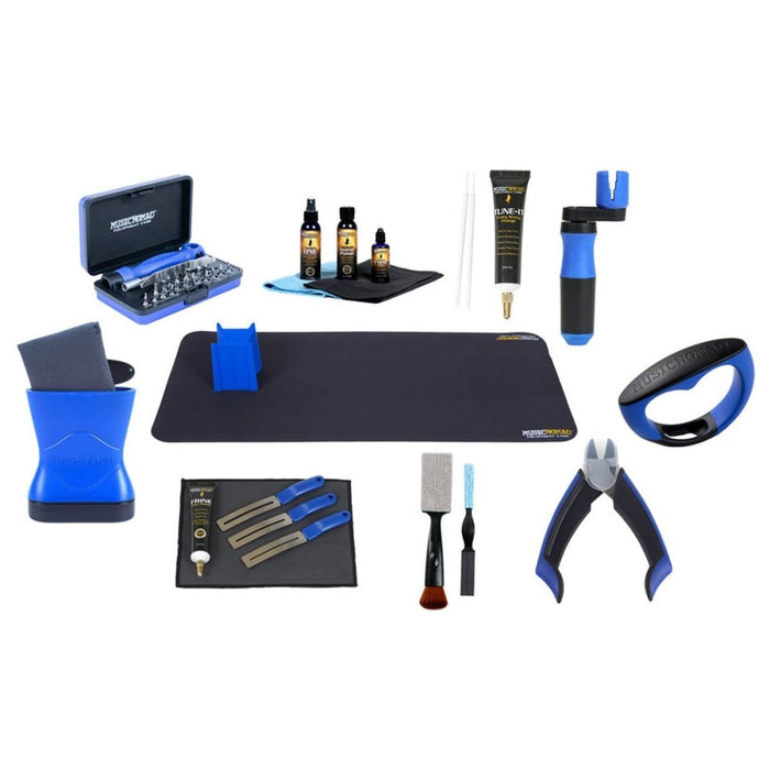 Music Nomad's Ultimate At Home Work Station features 11 of our "must-have" products. It starts with our premium work mat and innovative neck cradle that allows you to safely work on any string instrument. Then we give you all the product to detail, clean, polish and condition all the necessary areas to maintain and protect your gear. Lastly, we include all our premium string changing tools so string changing is a cinch.
