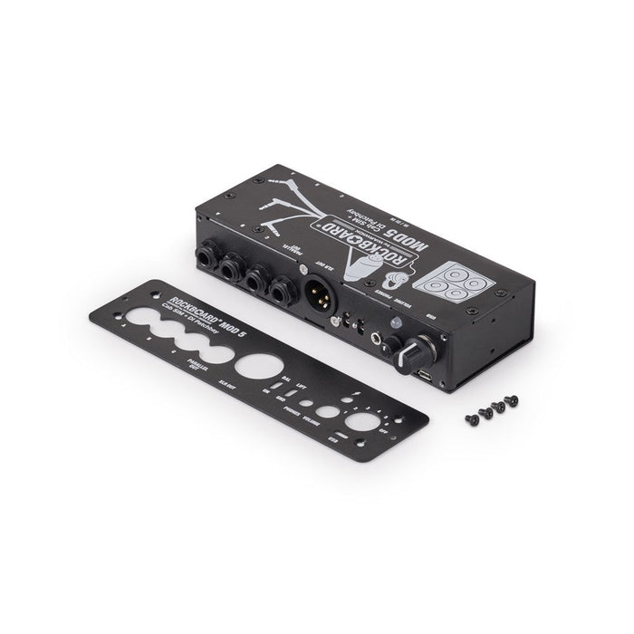 The RockBoard® MOD 5 Cab SIM + DI Patchbay offers customizable, IR-based stereo speaker cabinet simulation, an active DI box, as well as a simple solution to organize all the connections to and from your effects setup. Whether you are using a RockBoard® or any other brand pedalboard - the MOD 5 will open completely new possibilities. The speaker cab simulation & DI let's you go direct, providing YOUR sound, whatever backline is being provided at the venue you're playing. You want to use your favorite cab? No problem, load an impulse response of its sound into the MOD 5 and you have it with you, wherever you go. The patchbay part is designed to route connections from underneath your pedalboard to its front, in order to give you a central access point to your setup and tidy up your connections. For silent and on the road practicing, the MOD 5 also provides a headphone amplifier with adjustable output volume.