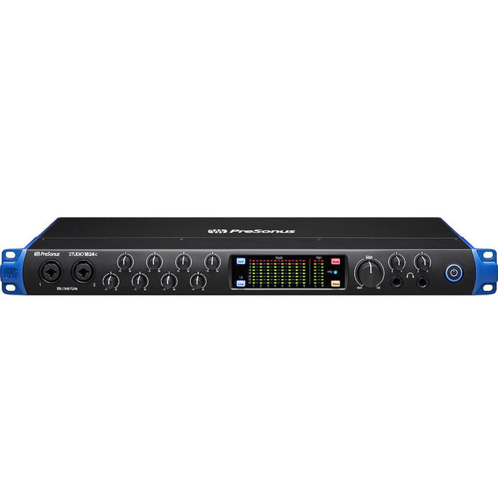 PreSonus® was a pioneer in high-channel-count audio interfaces and has spent the last 20 years creating the best audio interfaces for recording large sessions. Building on this legacy, the Studio 1824c provides amazing sound-quality with eight of PreSonus’ lauded XMAX analog mic preamps onboard and pristine 24-bit 192 kHz conversion. Add two low-noise instrument preamps, balanced line-level inputs, and an ADAT input to add 8 more channels whenever you need them, and you have an audio interface ready to record just about any session. When you have the right tools, any job is easier and faster to finish. High-quality converters and PreSonus’ professional-grade XMAX mic preamps capture complex musical harmonics smoothly and naturally, with no audible distortion. XMAX mic preamps deliver incredibly high headroom, deep lows, smooth highs, and a rich overall sound, so you’ll hear every breath, transient, and detail in your recordings. Professional input and output metering let you keep an eye on your levels. A flexible DSP mixer lets you create four discrete near-zero-latency monitor mixes. Front-panel Mute, Mono, and level controls let you work with your main mix. Whether you're upgrading your studio or building a new space for your band to record, the Studio 1824c has you covered with superior mic preamps, expandable inputs, and powerful, easy-to-use onboard monitor mixing to give you the world-class results you want. FEATURES Up to 18 inputs/20 outputs simultaneously (8x8 at 192 kHz) 2 mic/instrument/line inputs with XMAX Class A mic preamps 6 mic/line inputs with XMAX Class A mic preamps 8 channels of ADAT Optical I/O (4 channels at 96 kHz) 2 balanced ¼-inch TRS main outputs and 8 balanced ¼-inch TRS line outputs for monitor mixing, all DC coupled for sending control voltages 2 stereo headphone outputs with individual level controls Stereo S/PDIF digital I/O and MIDI In/Out 18x8 onboard DSP monitor mixer Front-panel level controls plus Mono and Mute buttons for the main outputs True +48V phantom power for condenser microphones (global) 10 ladder-style 8-LED level meters (8 input, 2 main output) 24-bit resolution, 44.1, 48, 88.2, 96, 176.4 and 192 kHz sampling rates USB-C to USB-C and USB-C to USB-A cables included for compatibility with most computers Includes Studio One Artist®, Studio Magic Software Suite, and Ableton® Live Lite