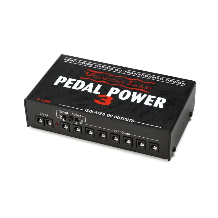 The Voodoo Lab Pedal Power 3 sets new benchmarks for noise, current, and weight. The secret lies in Voodoo Lab's hybrid DC transformer design. It outputs an extremely linear DC charge that, thanks to its 80-nanosecond polarity reversal, is nearly noise-free out of the gate. And that's before its advanced computer-optimized filtering. A premium analog signal path comprised of large ceramic capacitors and organic polymer filters ensures you get top performance from all your stomps: your high-draw digidelays to your old-school fuzz boxes.